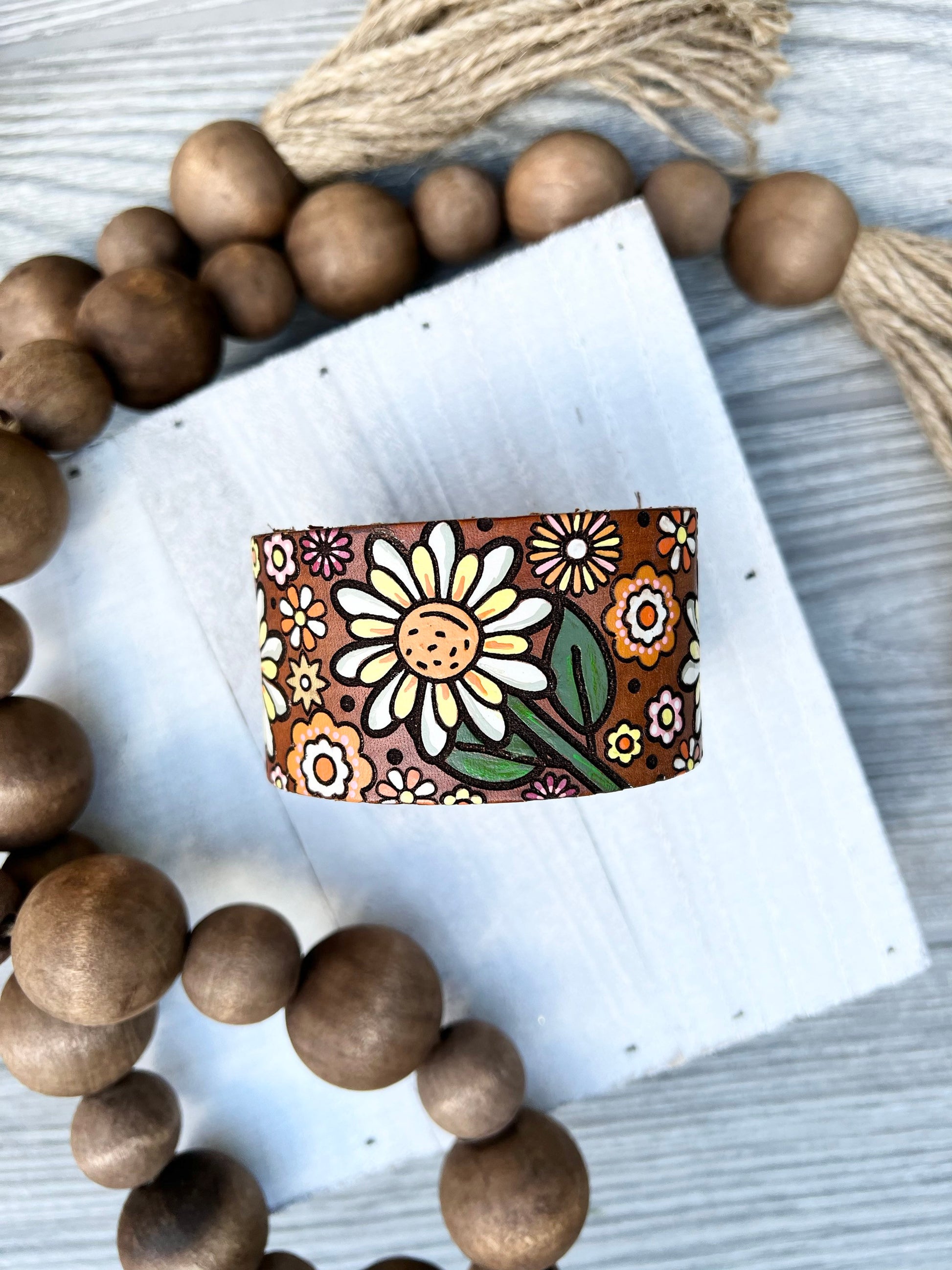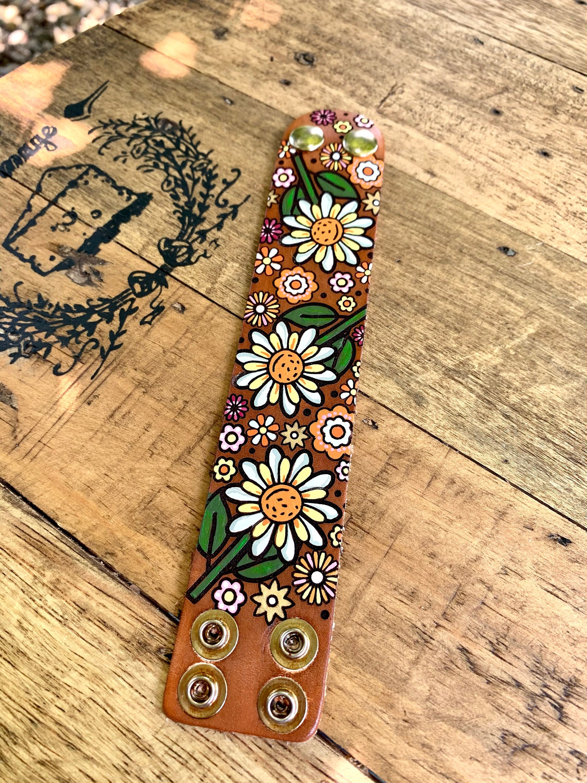 Mod pop flowers leather bracelet. This is a cute and fun hand tooled and hand-painted leather bracelet