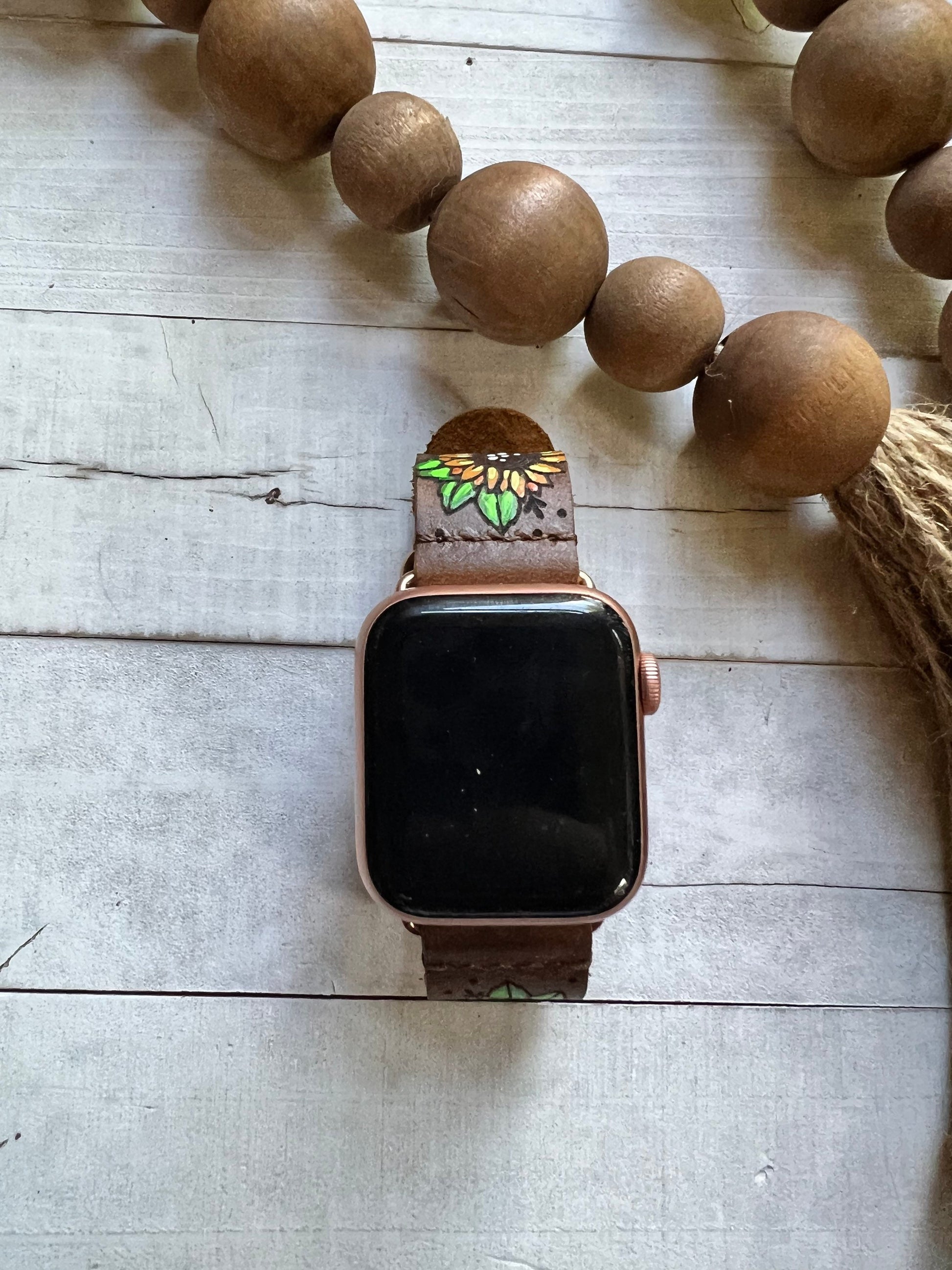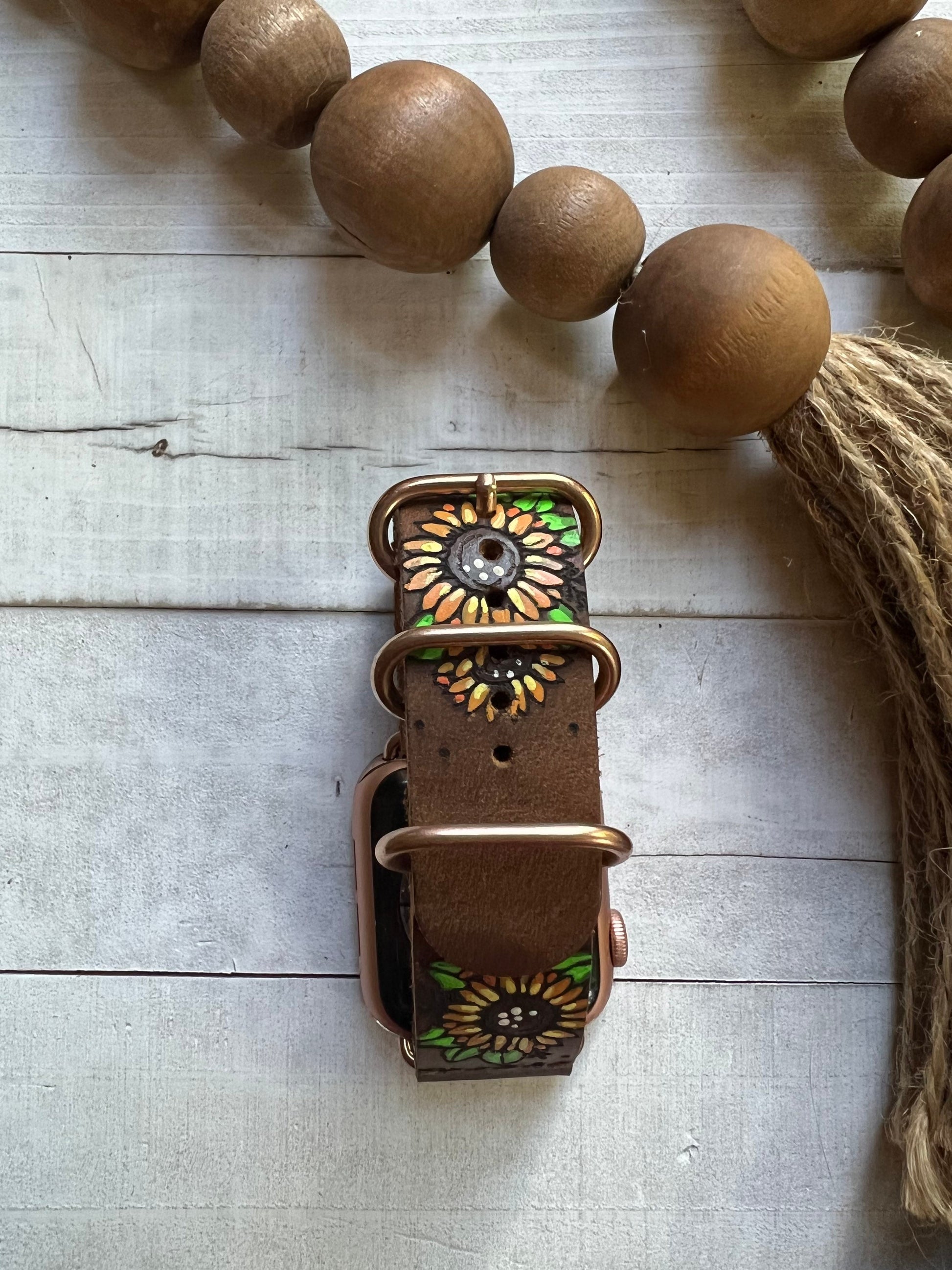 Genuine leather smart watch band. Our items are all handmade, tooled,stamped,engraved and hand painted. We apply a special finish to prolong the beauty of the painted finish and leather material.